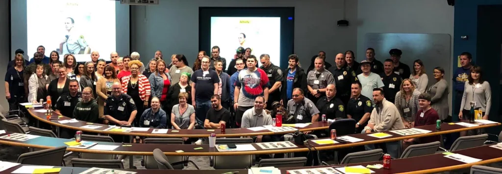 Each officer was then paired with an individual with exceptional needs to watch an interactive screening of BE SAFE The Movie. BE SAFE The Movie shows how people with autism can interact safely with police officers in different everyday situations. After watching each movie scene, officers and their partners practiced life-saving skills such as asking for help and following instructions. As they were mentoring their partners, the officers were also actively learning from them, gaining firsthand experience.